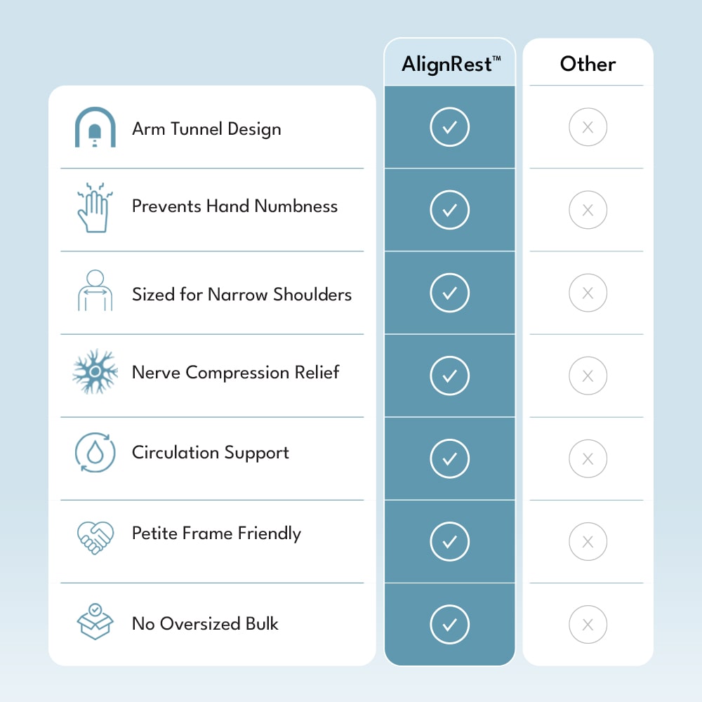 Our revolutionary arm tunnel design eliminates nerve compression and restores natural circulation, so you never wake up with pins and needles again.