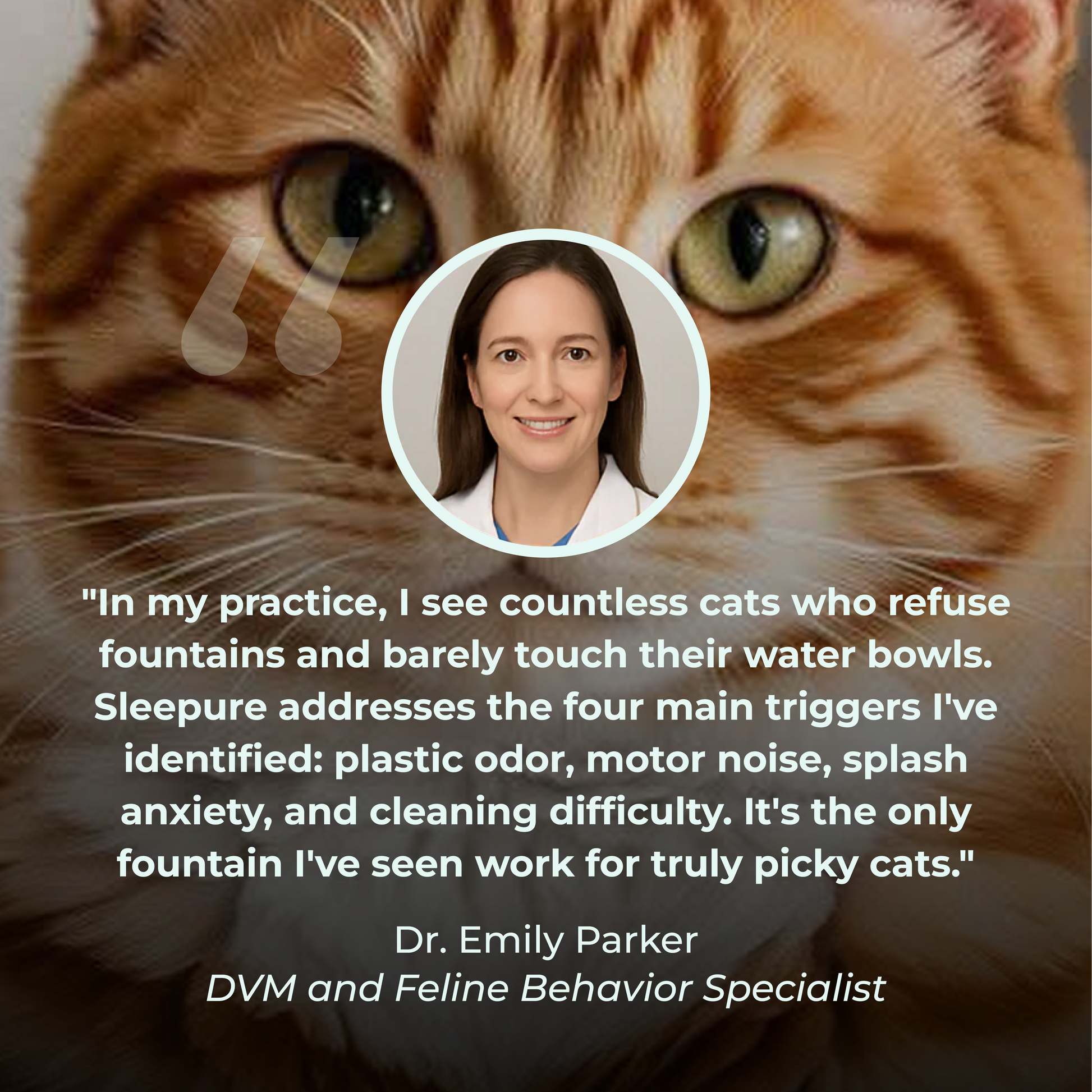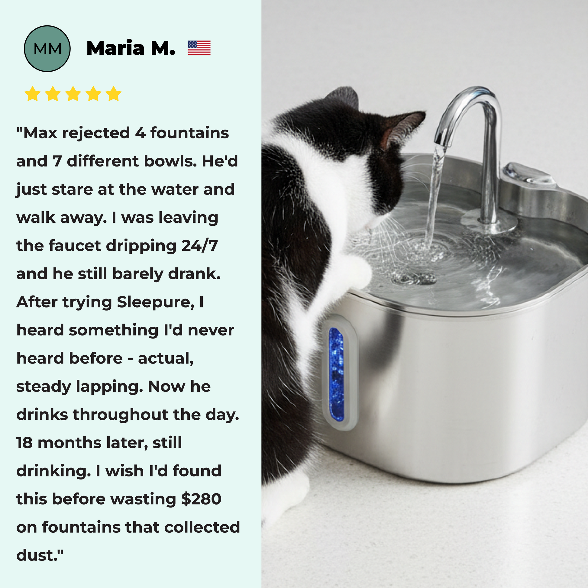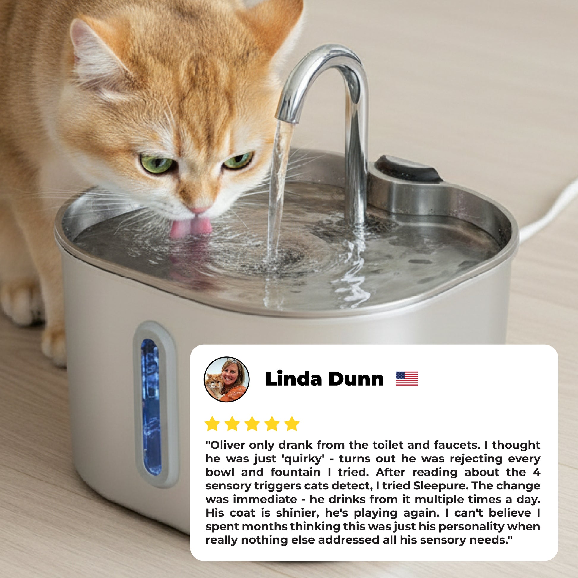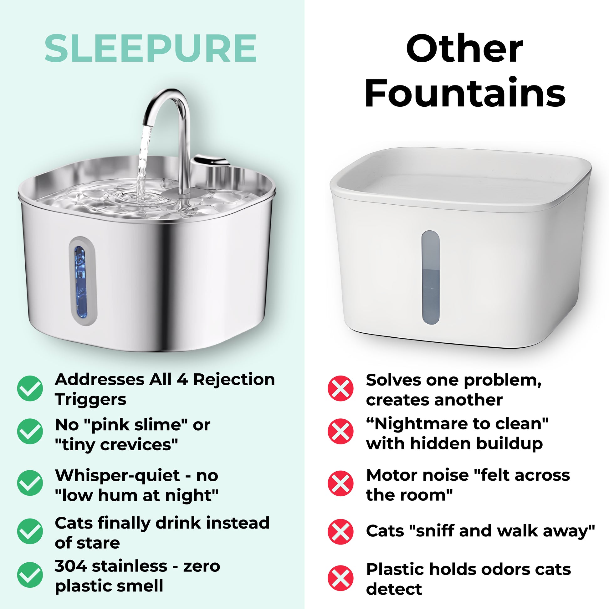 Sleepure isn't another partial solution. It addresses smell, sound, flow, access, and cleaning simultaneously—the only way sensitive cats will finally drink comfortably.
